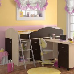 Кровать-чердак "Дюймовочка-5.1" рассчитана на двоих детей, так как объединяет два полноценных спальных места. Выдвижная нижняя кровать может устанавливаться отдельно от комплекса. Под верхней кроватью имеется стеллаж с открытыми полками и два отделения с дверцами. Такой уголок экономит пространство в детской комнате. Кровать подойдет детям от 1 года до 18 лет.