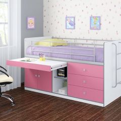 Кровать оборудована металлической лестницей. Прочная конструкция рассчитана на детей от 1 до 18 лет. Такой комплекс экономит пространство и полностью обеспечивает выполнение всех многообразных функций детской и подростковой комнаты.