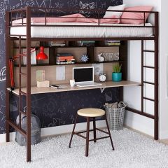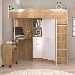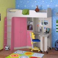 Кровать-чердак "Теремок-М85" - это целый комплекс мебели, включающий в себя спальное место размером 200*80 см, шкаф для одежды, пенал с ящиками и полноценный рабочий стол. Прочная конструкция рассчитана на детей до 16 лет. Такой уголок экономит пространство в детской комнате, при этом обеспечивая все необходимые функции.