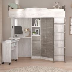 В комплект входит: кровать, внизу которой расположены вместительный угловой шкаф (полки и штанга), стеллаж для книг и компьютерный стол с дополнительным столиком.