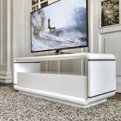 Малая напольная тв-тумба Opus Uno оригинального дизайна в стиле футуризм, минимализм. Тумба снабжена одним выдвижным ящиком и вместительной нишей под аппаратуру. Размер ниши и ящика: 1100х350хh140 мм. Габариты и конструкция тумбы позволяют устанавливать телевизоры диагональю до 50', весом до 30 кг.